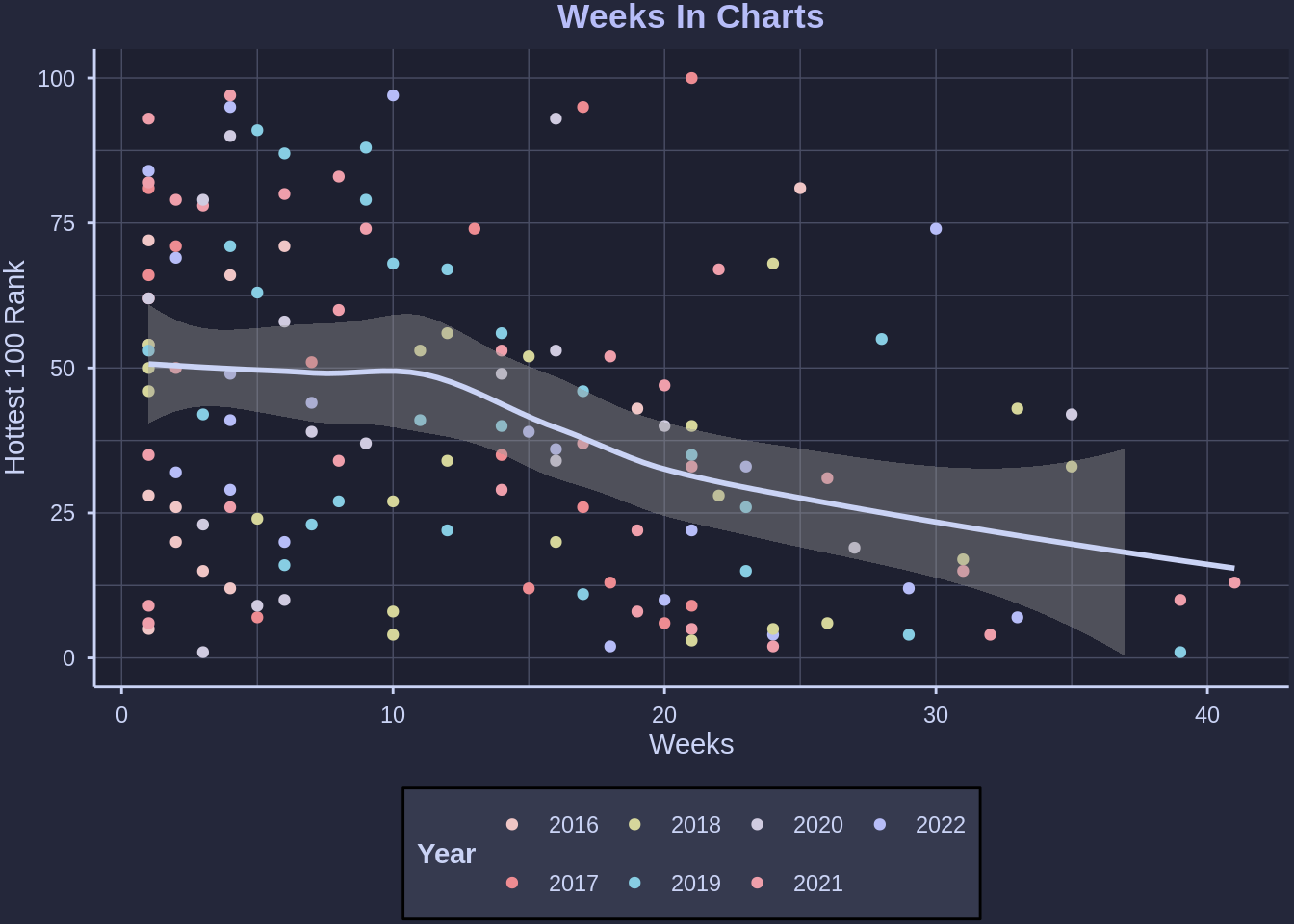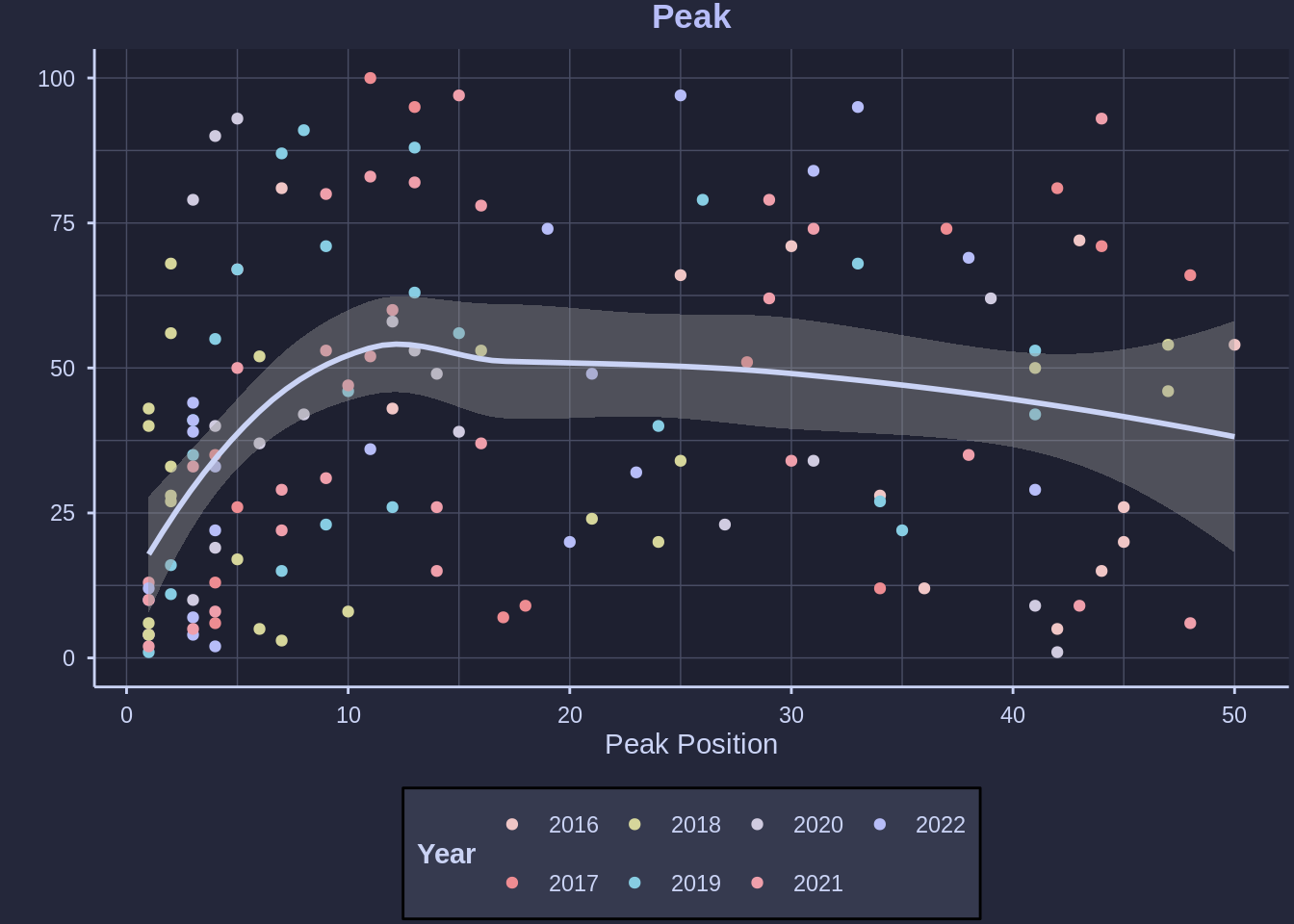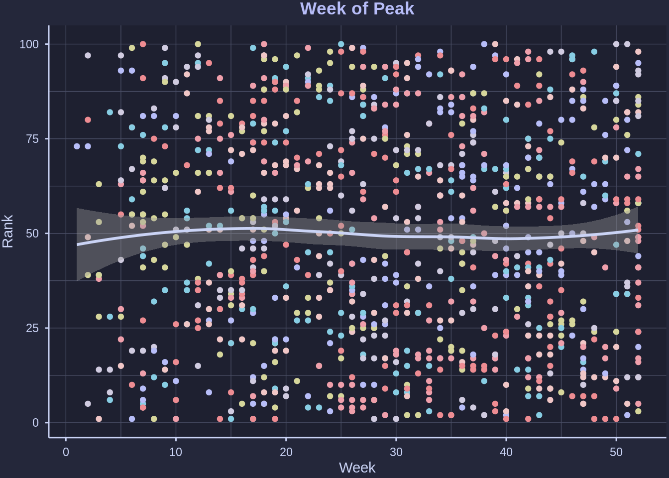 To address this, I have compiled some statistics that consider the peak of the songs, which should eliminate any advantage for being released at the beginning of the year.