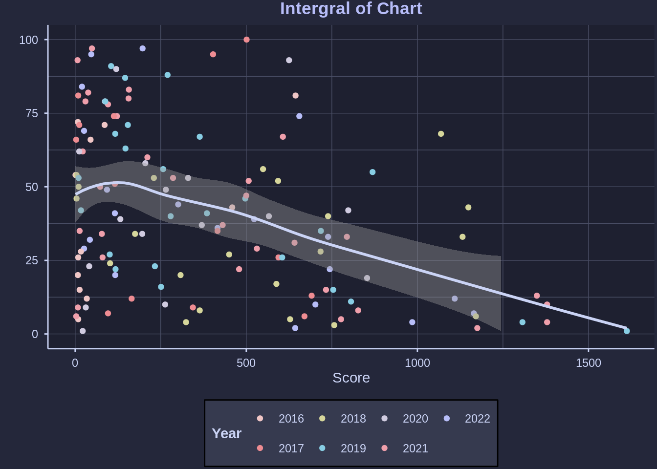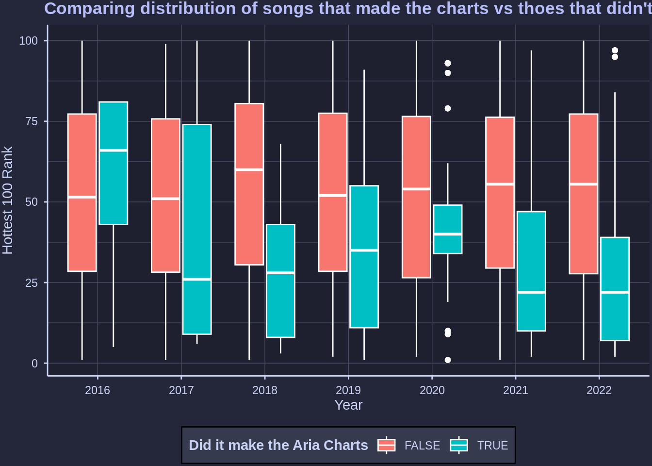 From this chart, we can see that songs that make the charts are outperforming songs that don’t. But more importantly, it shows us that making the charts is not a deal-breaker on whether or not a song will perform well in the Hottest 100.