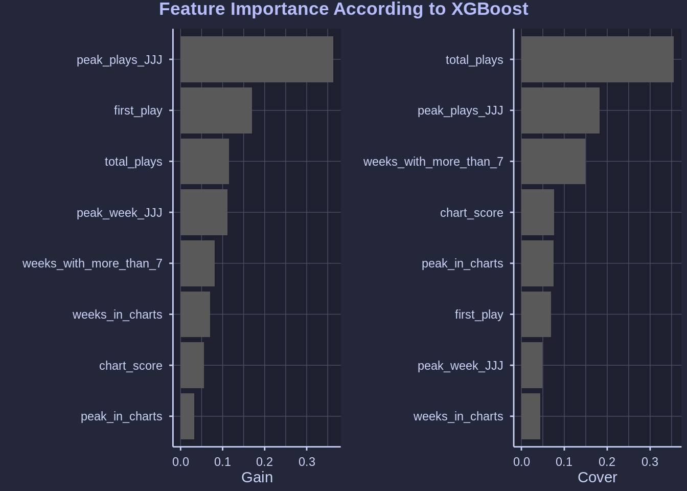 A nice thing about XGBoost is that it can provide insight into the most important factors it uses to predict the results. From the above plots, we can see that the peak of the song on triple J and its total plays contribute significantly to the predictive power.