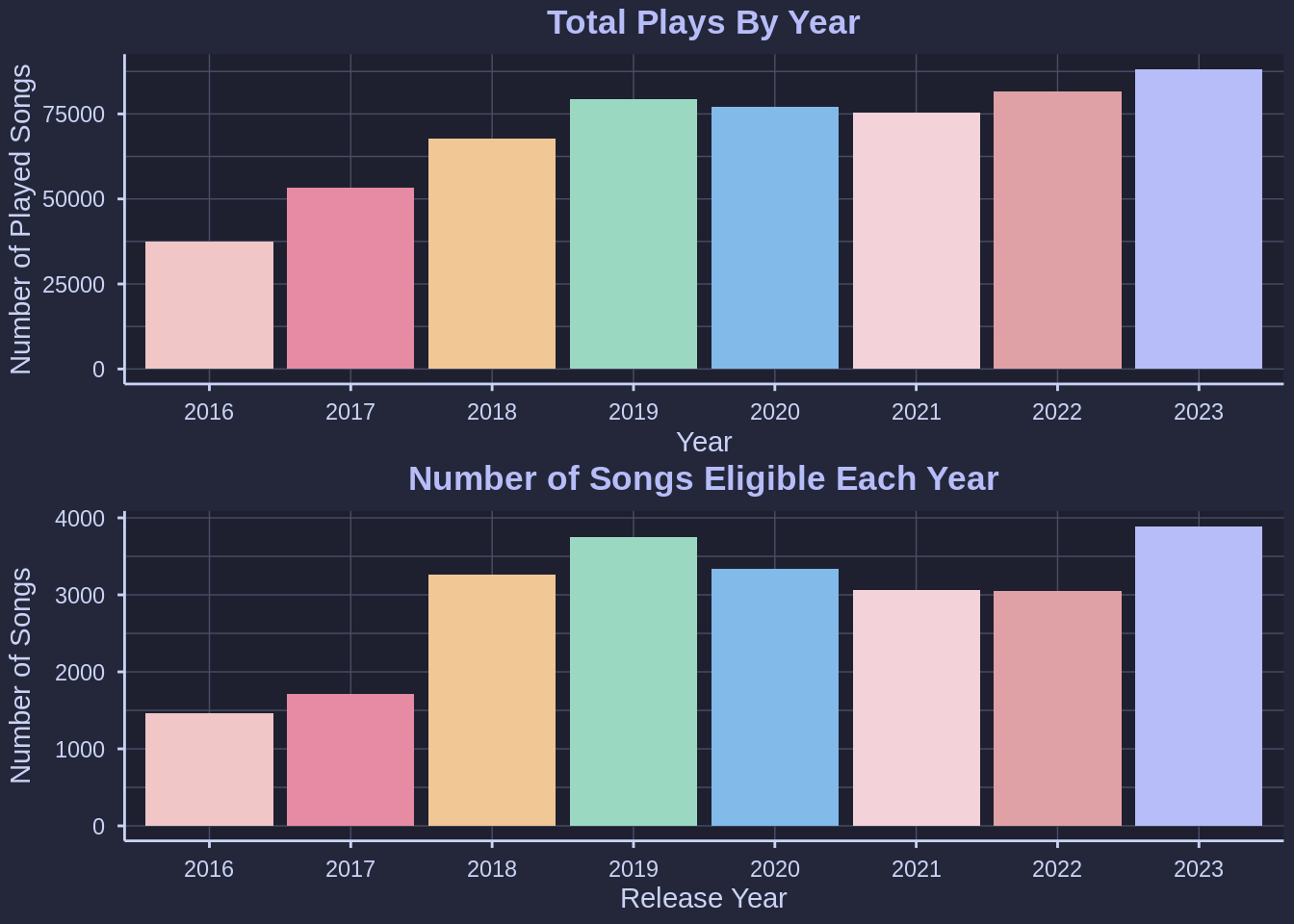 A thought I had while looking at the absolute play data is that it disproportionately rewards songs that were released earlier in the year.
