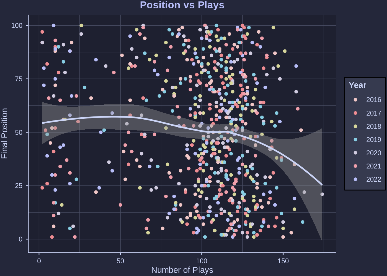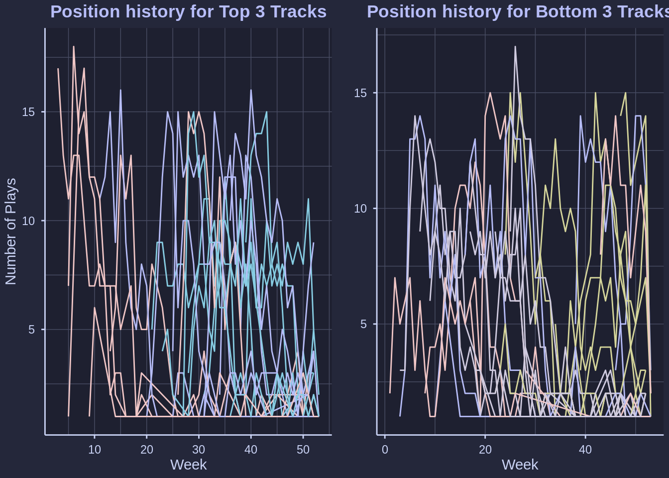 Looking at the rankings, we can see that the total number of plays doesn’t have a massive impact on performance. A song can have five plays or a hundred, and it seems to have a similar outcome in the rankings.