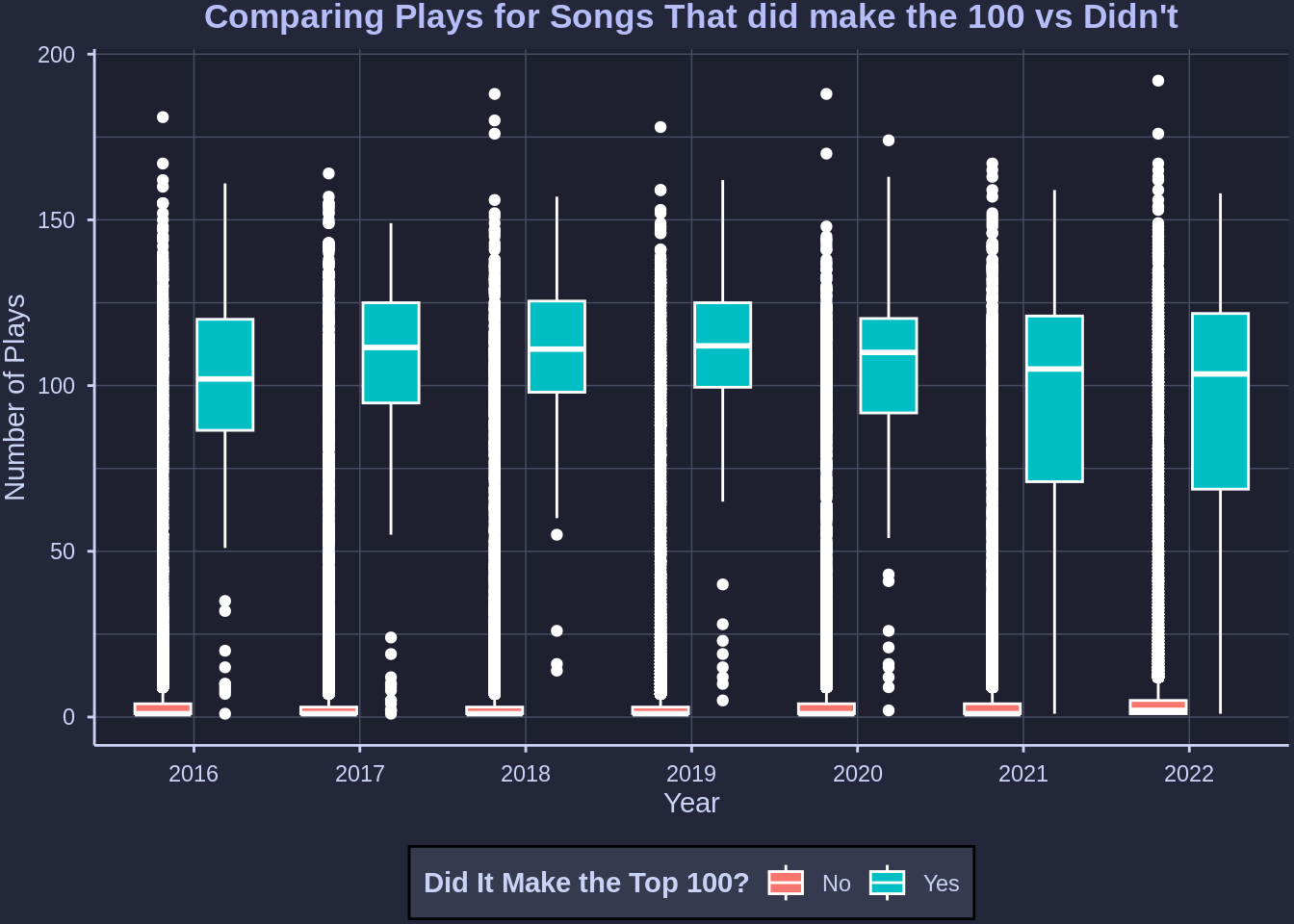 Looking at this plot, we can see right away that a song that made the Hottest 100 got more plays than those that didn’t, but also that plenty of songs that didn’t make the 100 got a comparable number of plays.