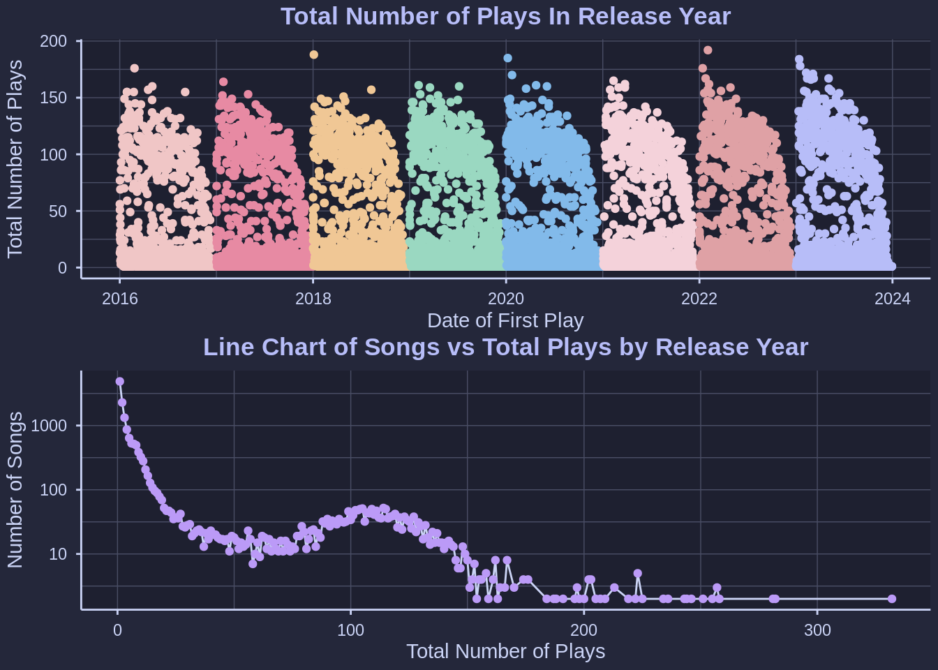 These plots give us a good insight into the trends in how Triple J selects songs. We have a lot of songs with almost no plays, which are mostly songs that are being presented to the audience to gauge their reaction. If they become popular, the songs will be played frequently, indicated by the absence of songs with 40-60 plays. However, very few songs receive excessive playtime, with only a handful surpassing 200 plays.