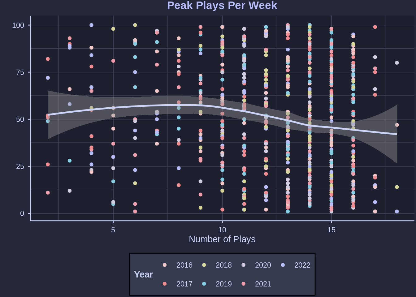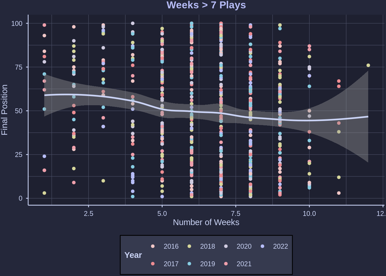 Again, we can see that there is some useful information, with the peak plays per week showing that songs which have a big peak generally perform well in the final rankings. However, as with the absolute count of plays, there doesn’t seem to be a hard and fast rule.