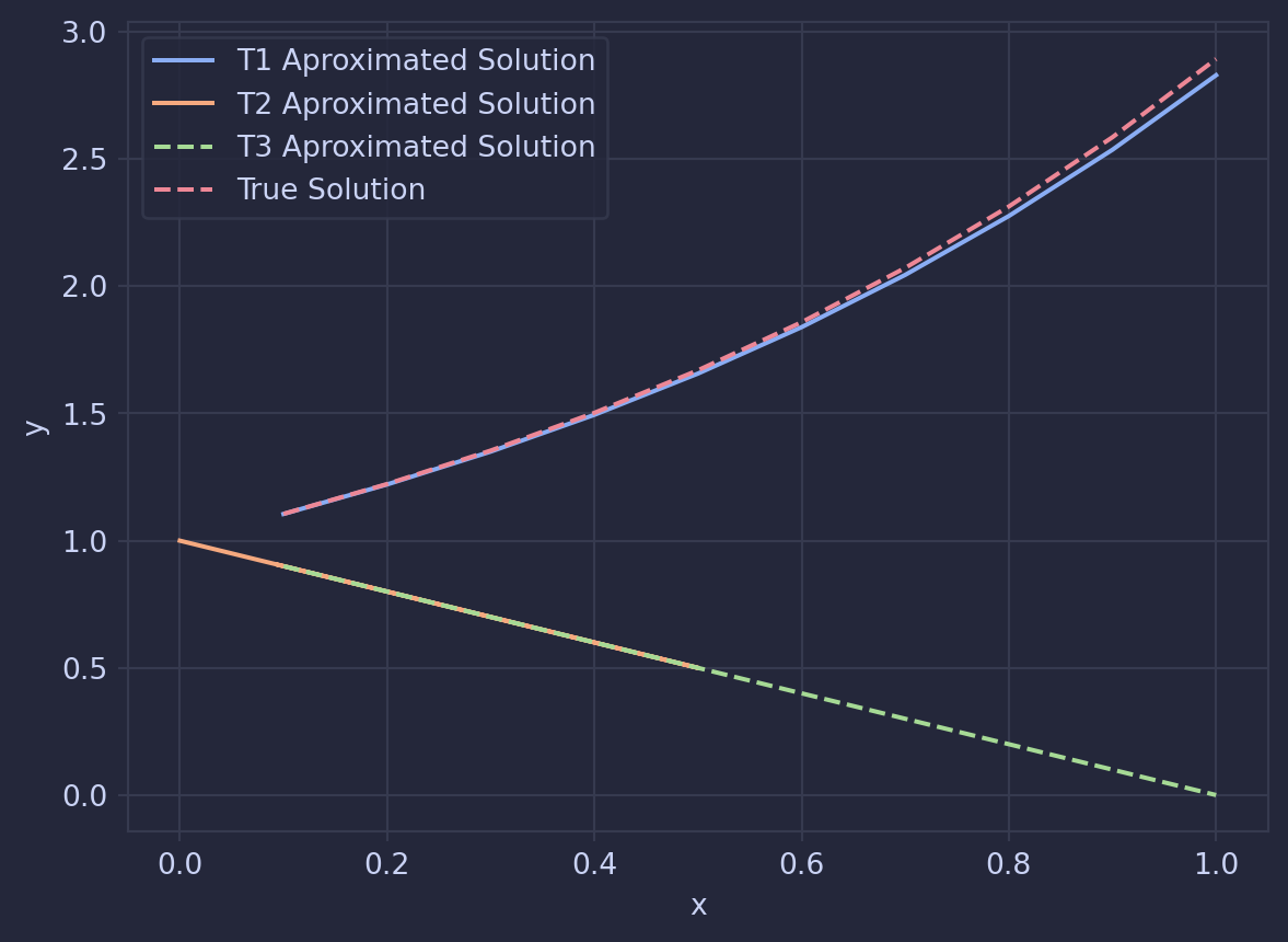 Truncation error is the error that is introduced by approximating a infinite series, such as the Taylor series we use, with a finite number of terms. I’m suspecting in this case, that \(T_1\) introduces the least amount of truncation error at each step and this is why it is the best aproximation of the ODE.