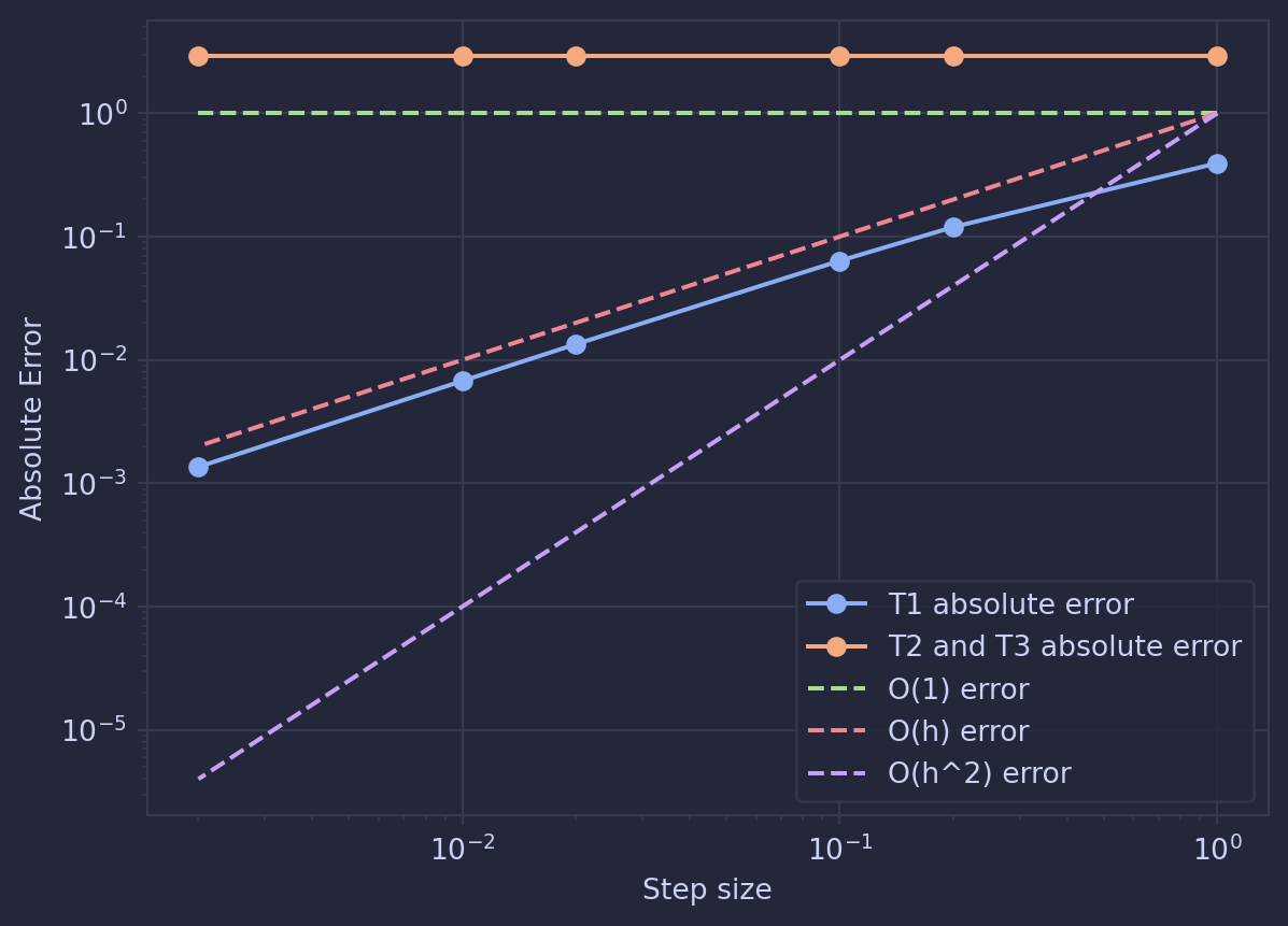 We can now test this by running some approximations with various values of h and the different matrices, the results for which are below. We can see that the \(T_1\) result follows the \(O(h)\) curve while the \(T_2\) and \(T_3\) result follows the \(O(1)\) curve.